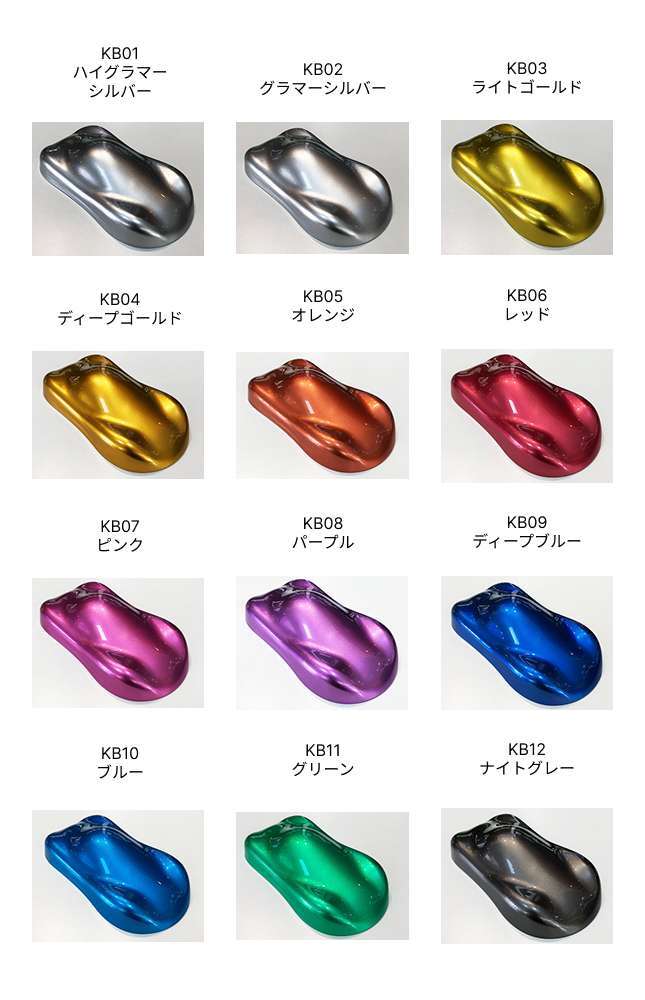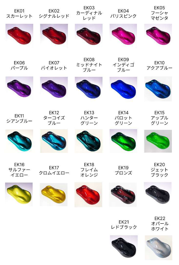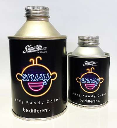 キャンディーカラーは輸入品を含め、染料が多くを占め一般的に色飛びが激しい塗料と言われておりますが、envy Kandy Colorは顔料を使用する事により、色飛びを最大限に抑えるKANDY COLORとして開発いたしました。一般的に顔料は粒子感が大きいため、隠ぺいが良い塗料とされておりますが、envy Kandy Colorは顔料を染料の粒子感(NANO粒子)に砕く、と言う技術により現実したKANDY COLORです。envy Kandy Color 全22色とenvy Kandyベースカラー全12色とで264色のカラーが楽しめます。envy Kandy Colorはコンセントレート(濃縮)タイプなので クリアーに混ぜて使用していただきます。