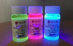 動画を見て下さい。Spookyは通常光の下では無色透明で見えませんがブラックライトを照射すると鮮やかなネオンカラーが発色します。