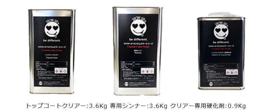 SHOW UPカスタムカラーシリーズクリアーは従来のクリアーより光沢、肌ノビが良く、隣接パネルとの群がりが良いのでオールペイントなどの大面積の塗装に適しております。