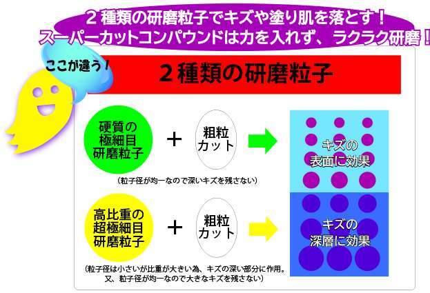 数種類の大きさ、硬さの異なる粒子を配合し、3000#のペーパー目を消し、1工程で鏡面まで仕上げることが可能な水性ノンシリコンのコンパウンドです。